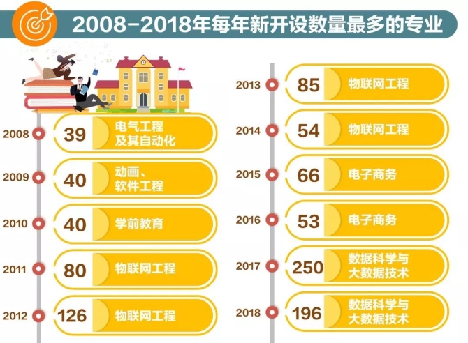 很多人想选热门专业,那什么是热门呢?我们发现,国家政策及未来发展趋势催生新兴热门专业。大数据、人工智能、智能制造等成为高校培养人才的新方向,紧跟新技术和互联网社会的变革。数据显示,2017年和2018年,新开设数量最多的专业均为“数据科学与大数据技术”,分别是250个和196个。此外,今年新增开设智能科学与技术和人工智能专业的高校分别达到96所和35所。