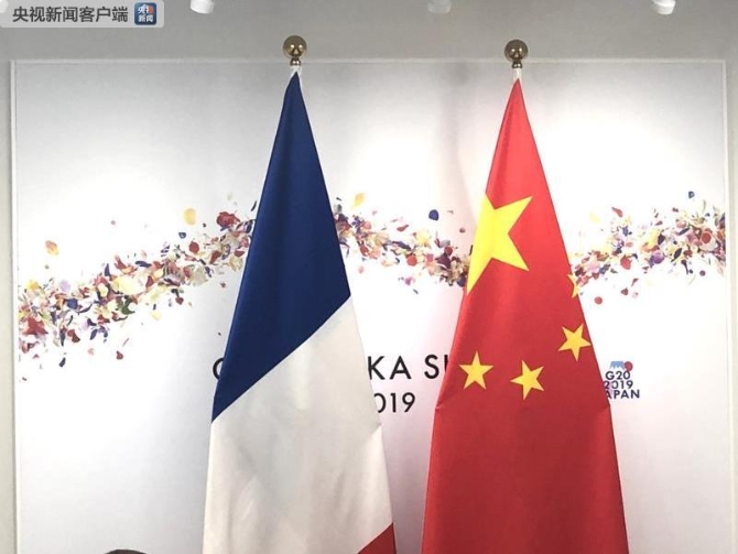 △会谈现场的中法两国国旗。(记者 王哈男拍摄)