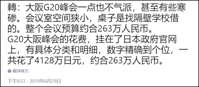 闭幕后,网络上出现了一个说法:“日本开G20很节俭,只花了4128万日元,折合人民币约263万元。”
