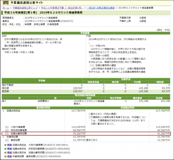 大阪府2018财年第1次补充预算(2018年3月5日公布)中,大阪府政策企划部企划室得到了一笔名为“2019年G20峰会推进事业费”的预算,总额为2.17782亿日元。