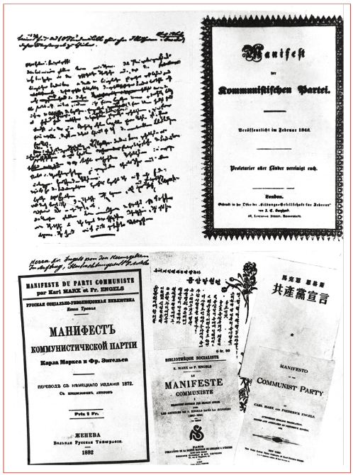 《共产党宣言》是第一次全面阐述科学社会主义原理的伟大著作,一经问世,就在实践上推动了世界社会主义发展,深刻改变了人类历史进程。图为《共产党宣言》的一页草稿(左上图)和多种文字的《共产党宣言》版本。 新华社发
