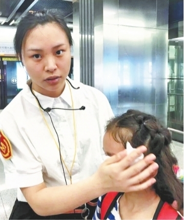 地铁站工作人员安慰小女孩