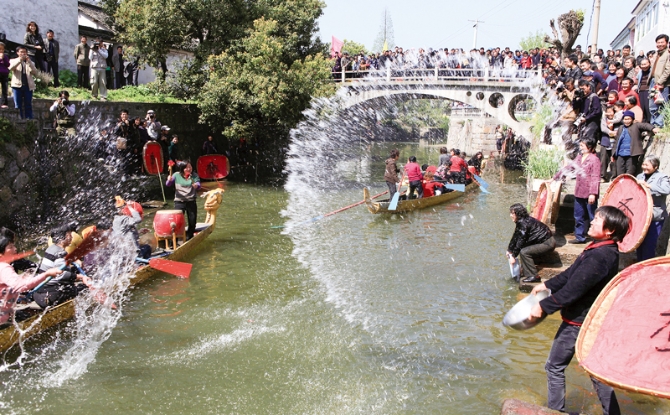 浙江“千万工程”以治理好涉及千家万户的“关键小事”为切入口,掀起“垃圾革命”、“污水革命”、“厕所革命”,使广大乡村迎来翻天覆地的变化,再现天蓝水清的美丽景象。图为湖州市德清县下渚湖街道塘泾村的村民举行泼水祈丰年活动。 浙江省农办供图