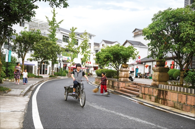 浙江“千万工程”从抓好道路硬化、路灯亮化、卫生洁化、村庄绿化、河道净化开始,大力推进农村人居环境整治,村容村貌和农村生态环境发生了深刻变化。图为杭州市淳安县枫树岭镇下姜村村民在干净整洁的村庄里骑行。 新华社记者 黄宗治/摄