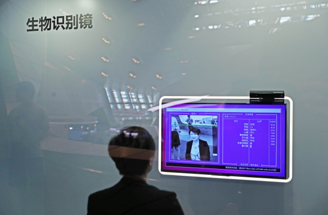 7月1日,在大连国际会议中心,参会嘉宾体验生物识别镜。