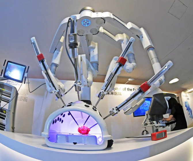 7月1日,在大连国际会议中心,手术机器人进行手术模拟操作。