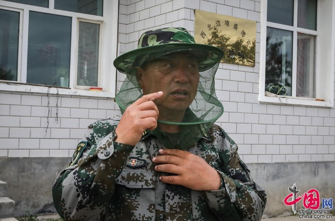 马军武展示用来防止蚊虫叮咬的“装备”。在这里生活的人都说,一年可能会“死”四次:春天被洪水吓死,夏天被蚊虫咬死,秋天被风沙刮死,冬天被冰雪冻死。夏季,这里作为世界四大蚊虫聚集地之一,一种名为“小咬”的虫子肆虐,能将牲口咬死,巡逻时为防止叮咬,马军武会用一块在柴油中浸过的纱布顶在头上,脸上时常被烧得火辣辣;冬季,气温近零下40度,狂风暴雪频发,冰雪封路长达半年,与世隔绝。中国网记者伦晓璇 摄