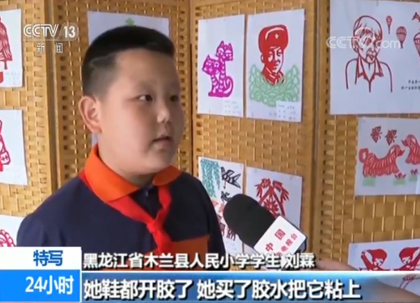 黑龙江省木兰县人民小学 学生 刘霖:她鞋都开胶了,她买了胶水粘上,感觉她很节约很伟大,很尊敬马奶奶,我和我的同学包括我的老师,也一起以马奶奶为主题剪了一些剪纸作品,这个就是马奶奶自画像。