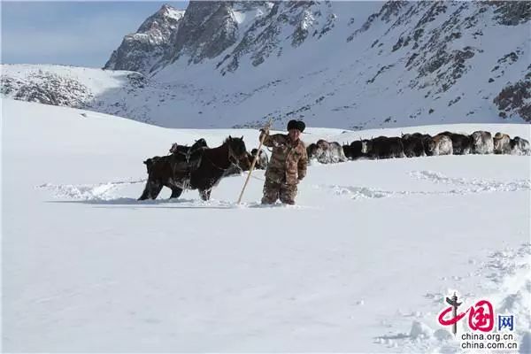 2016年3月4日,努尔江赶着牦牛翻越冰大坂。 新疆生产建设兵团第四师七十八团刘建 供图