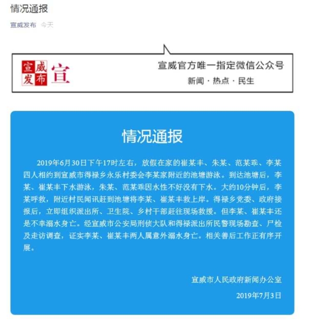 7月3日,宣威市人民政府新闻办公室发布情况通报。4名学生相约池塘游泳,2名学生不幸溺亡。通报详情如下