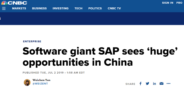 另据美国CNBC网站7月2日报道,德国软件巨头思爱普(SAP)公司认为中国市场有“巨大”的机遇,将寻求在中国大举扩张。SAP总部位于德国沃尔多夫,在企业资源管理(ERP)软件市场占有重要地位,是全球最大的企业应用软件提供商之一。