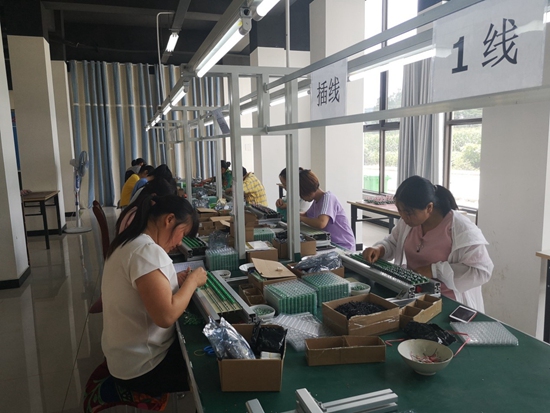 在移民安置小区一栋六层小楼的一楼,竖着一面“镇巴县社区扶贫工厂”的牌子,走进去,宽敞的“车间”里,近百名妇女正在对太阳能节能灯具电路板进行加工。
