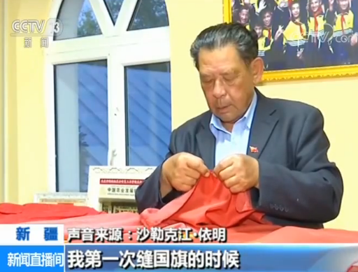沙勒克江·依明:原来针线也没有拿过,我第一次缝国旗的时候就把手扎上了好几次,后来慢慢慢就学会了。疼是疼,可是我不在乎疼。这是我的祖国母亲,这是我对母亲、我对祖国的一份爱。