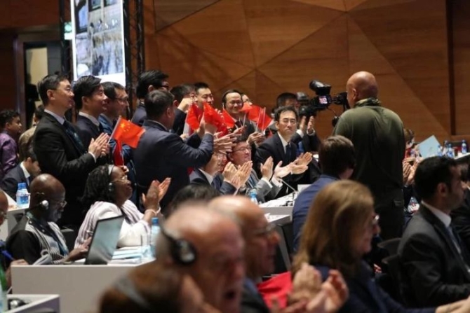 中国代表团全体起立鼓掌,挥舞国旗相互祝贺,脸上洋溢着自豪和喜悦的笑容。多国代表也纷纷上前,送上诚挚的祝贺。