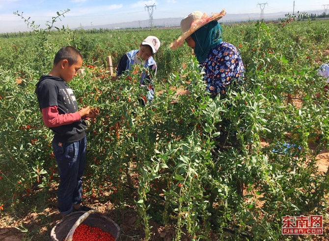 12岁的马巧玲与家人一同采摘枸杞。东南网记者 颜财斌 摄