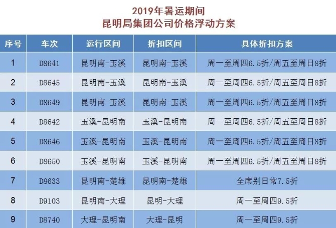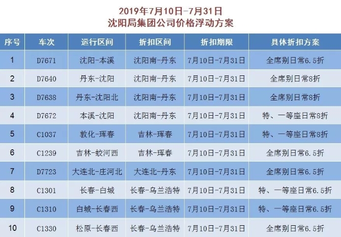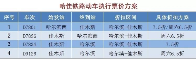 该票价方案执行时间自2019年7月10日起至另行通知时止。除上述公布折扣动车外,哈佳铁路其他动车组列车票价按公布票价9.47折执行。