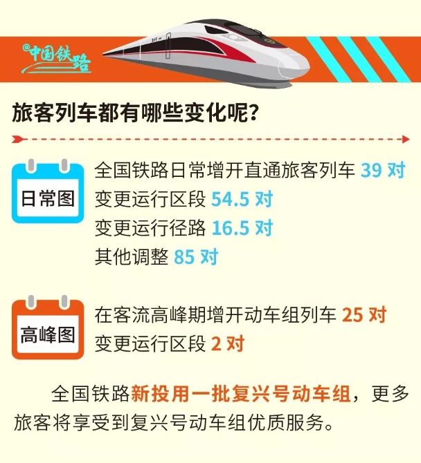 7月10日零时起,全国铁路实施新的列车运行图。调图后,全国铁路暑期高峰日均增加客运能力26万个席位。全国铁路还新投用了一批复兴号动车组,以便更多旅客将享受到复兴号动车组优质服务。