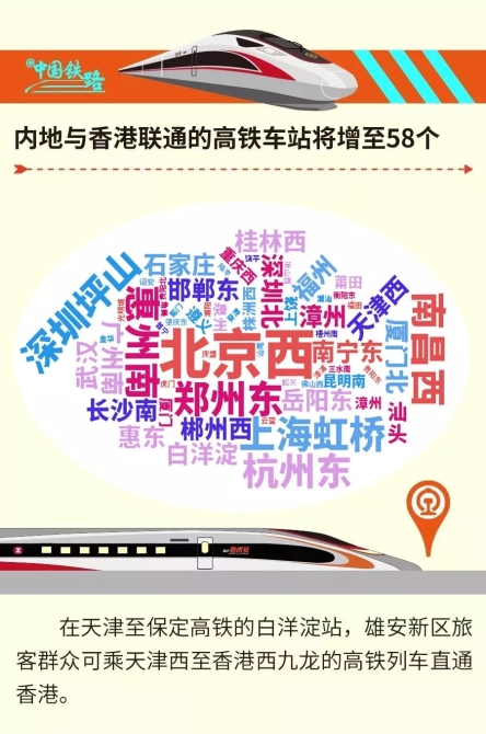 调图后,更多内地城市与香港将实现高铁联通。增开重庆西、天津西、南宁东、肇庆东、汕头至香港西九龙站动车组列车,增加遵义、贵阳东、白洋淀、邯郸东、岳阳东、衡阳东、梧州南、佛山西等站办理直通香港客运业务,内地与香港联通的高铁车站增至58个。在天津至保定高铁的白洋淀站,雄安新区旅客群众可乘天津西至香港西九龙的高铁列车直通香港。