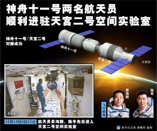 2016年10月19日,神舟十一号两名航天员顺利进驻天宫二号空间实验室。