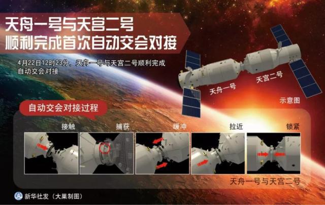2017年4月22日,天舟一号与天宫二号顺利完成首次自动交会对接。