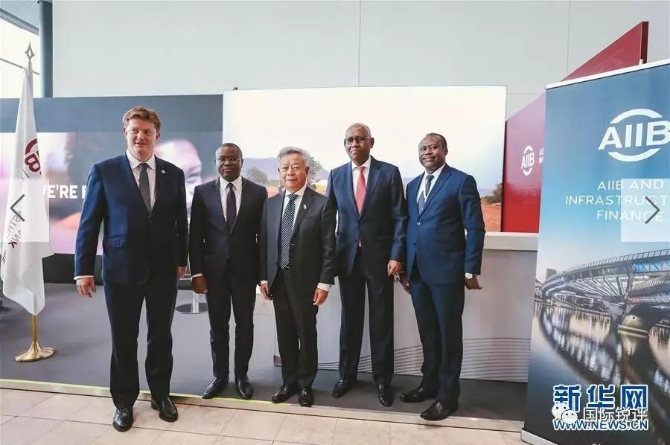 7月13日,亚投行行长金立群(中)与新加入亚投行的贝宁(左二)、吉布提(右二)和卢旺达(右一)代表合影。 (新华网)