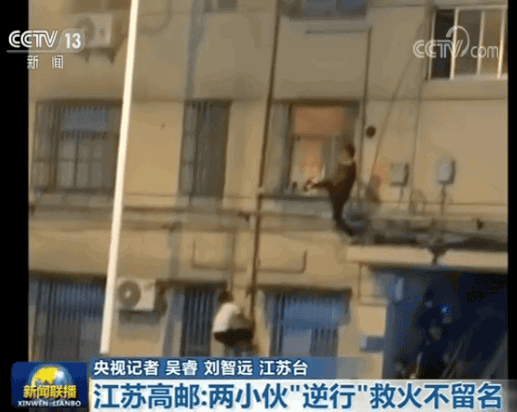 前不久,在江苏高邮,路过的行人发现二楼一居民家的厨房着火,火光越来越大。两名年轻人不顾自身危险挺身而出,爬楼破窗救火,事后又不留姓名悄悄离开。