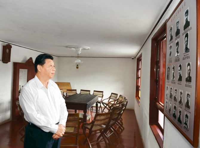 2015年6月16日至18日,中共中央总书记、国家主席、中央军委主席习近平在贵州调研。这是16日下午,习近平在参观遵义会议会议室时,向墙上的遵义会议参加人员照片深情凝视。 新华社记者 李学仁/摄