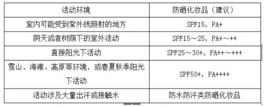 为了全面防护,要选择既能防护UVB又能防护UVA的防晒化妆品,即产品标签标识有SPF值和PA等级或广谱防晒的产品。那么是不是直接购买SPF值最大,PA“+”最多的防晒化妆品就最好呢?其实不然。虽然SPF值越大、PA“+”越多的产品防晒效果越好,但同时也意味着添加的防晒剂含量越高或者成分越复杂,过度使用会加重皮肤的负担,甚至还可能引起皮肤不良反应。因此应根据环境条件选用防晒化妆品,具体情况可参考下表。