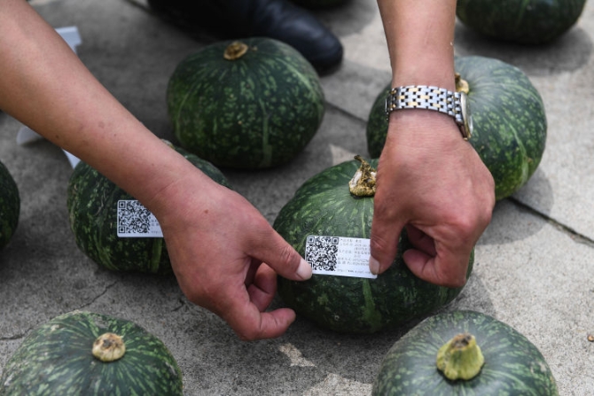 2019年6月27日,伟祥生态农业有限公司工作人员给一批即将销往上海的有机南瓜贴上农产品二维码。(新华社记者徐昱摄)