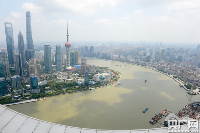 站在上海白玉兰广场顶层停机坪300余米的高空向下,俯瞰浦江两岸(央广网记者王晶 摄)
