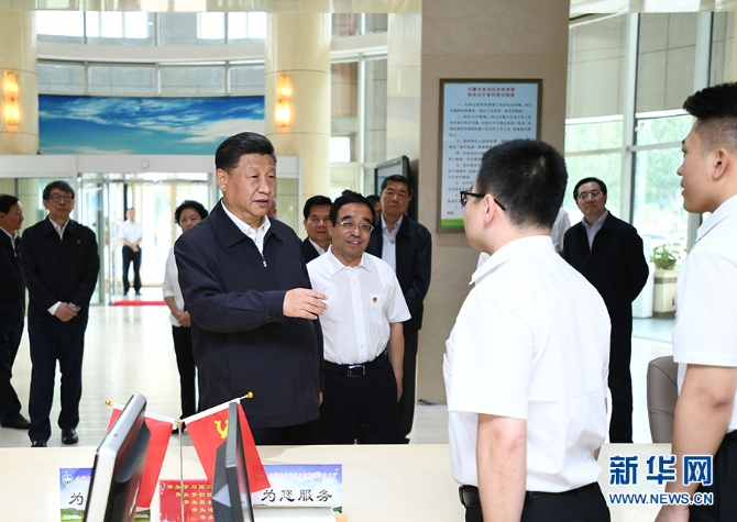 7月15日至16日,中共中央总书记、国家主席、中央军委主席习近平在内蒙古考察并指导开展“不忘初心、牢记使命”主题教育。这是16日上午,习近平在内蒙古自治区自然资源厅自然资源政务大厅同工作人员交谈,了解开展主题教育和落实便捷高效政务服务等情况。新华社 记者谢环驰/摄