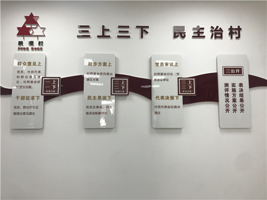 在枫源村的村口,竖立着一块醒目的标牌,上面有“三上三下,民主治村”八个大字,这是一种民主决策机制。所谓“三上三下”,即“一上一下”为收集议题,村两委会从群众中收集议题,通过上门下访征求意见;“二上二下”为酝酿方案,通过召开民主恳谈会,对方案进行深入讨论;“三上三下”为审议决策,方案提交党员会议审议,经村民代表会议表决通过后组织实施。