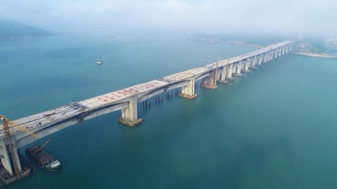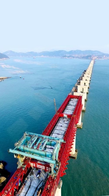 中国铁建大桥局施工的平潭段全长5.3公里,包括55个水中墩。大桥有116孔梁采用悬臂挂篮施工,依靠“挂篮”的移动让桥梁在空中“生长”,高峰期共有68对挂篮同时施工,创造了我国跨海大桥悬浇施工数量之最。