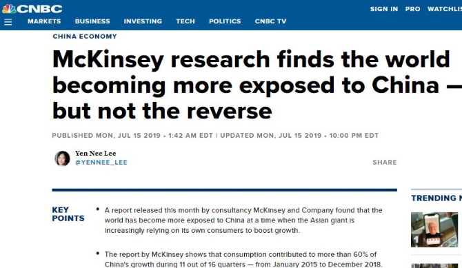 “世界其他国家受中国的影响越来越大,反映出中国作为一个市场、供应方和资金提供者的重要性越来越大。” 麦肯锡在报告中指出。