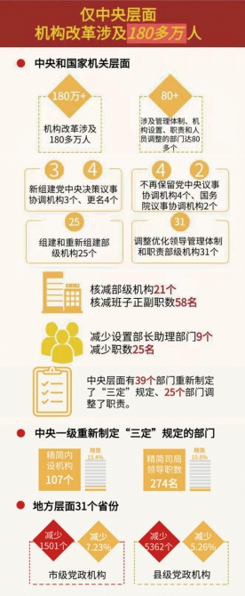 一年多来,在以习近平同志为核心的党中央坚强领导下,从中央到地方,上下同心,整体性推进各级各类机构改革,取得重大成效。 图表来源:新华社