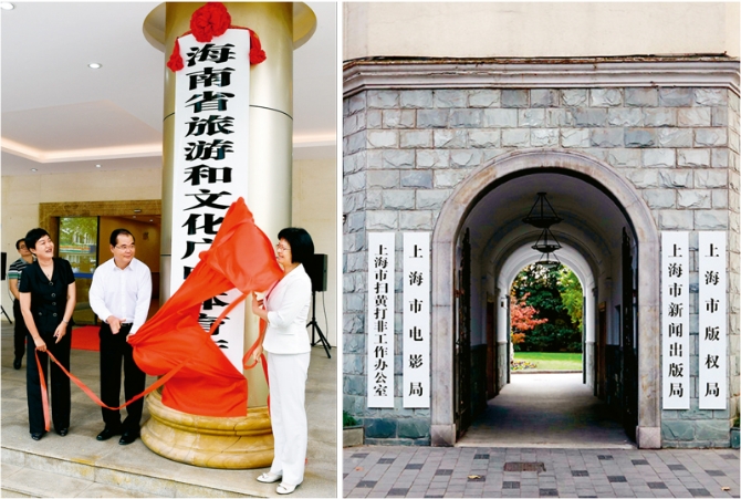紧张筹备,务实高效,新一轮机构改革蹄疾步稳向纵深推进。2018年9月13日,《海南省机构改革方案》印发,成为首个获得中央批准的省级机构改革方案;2018年11月11日,上海市委、市政府召开机构改革动员会,明确机构改革任务书。至此,我国31个省份机构改革方案全部“出炉”并对外公布。 左图为海南省旅游和文化广电体育厅挂牌成立(新华社记者 杨冠宇/摄)。右图为新挂牌的上海市新闻出版局、版权局、电影局(《解放日报》记者 蒋迪雯/摄)。