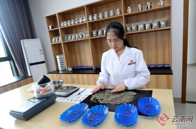 在云南(国际)咖啡交易中心的质检中心,质检员正在分拣咖啡豆,以此评定交易咖啡豆的等级。