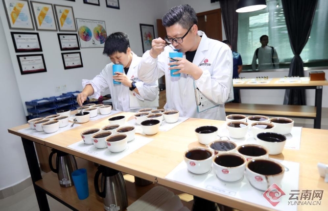 在云南(国际)咖啡交易中心的杯品中心,专业品鉴员正在评定交易咖啡的品质。