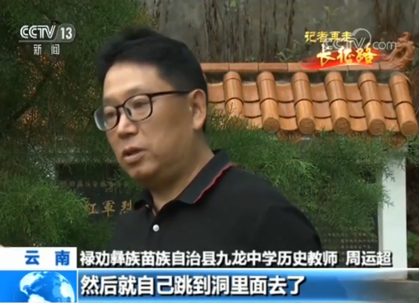 禄劝彝族苗族自治县九龙中学历史教师 周运超:朱光荣他是共产党员,江西瑞金人他是,那么他就站出来就跟他的战友说,我们革命不怕死,怕死不革命,不要让他们推,然后他们是高呼口号的,共产党万岁,红军万岁,然后自己就跳到洞里面去了。