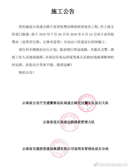 近日,云南省交投昆明东管理处发布施工公告:因实施昆石高速公路王家营收费站路面病害处治工程,经上级主管部门批准,7月26号至8月24号对王家营收费站(昆明至石林)双向出口匝道实行封闭施工。