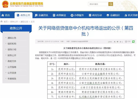 7月22日,云南省地方金融监督管理局网站发布了《关于网络借贷信息中介机构市场退出的公示(第四批)》,公示称,按照国家关于P2P网贷风险专项整治工作的要求,云南省对纳入范围的P2P网络借贷信息中介机构和民间融资登记服务机构开展了风险整治工作。并公示了第四批(7家)拟退出市场的机构,公示时间从7月22日起至8月6日。如有异议,可向省、相关州市、县(区)风险专项整治联合工作办公室反映。