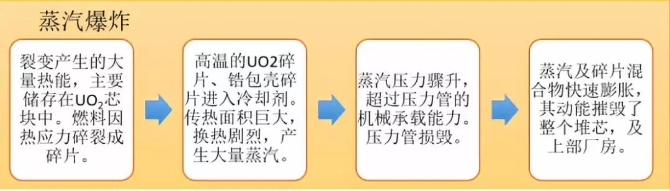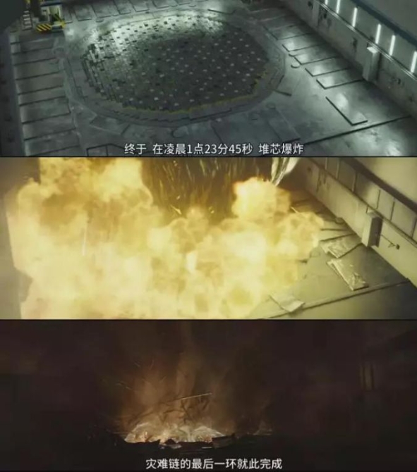 这是由于反应堆功率瞬间提升造成流过反应堆芯的水瞬间被加热汽化,蒸汽压力骤升超过管道可以承受的压力所造成的蒸汽爆炸。剧中的“切尔诺贝利三勇士”的行动就是为了排出地下室的水,防止高温的堆芯熔融物与地下水池接触发生蒸汽爆炸。(虽然目前科学界对苏联科学家计算的结果存在争议,但无论怎样都不可否认“三勇士”的牺牲自我、拯救他人的伟大精神!)