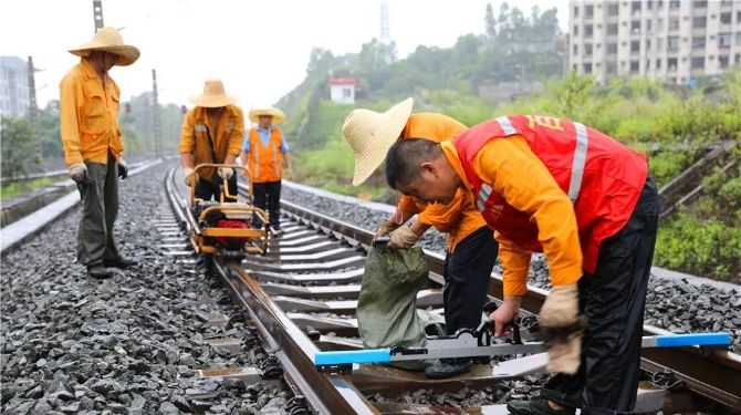 “现场是4的就放6,是0的就放2。”7月4日,在滂沱大雨中拆换钢轨垫板的工区职工冯金成,听到工长汪伯华的提醒,用手擦了擦垫板上的水,再三确认厚度无误后,才将垫板塞到槽里。