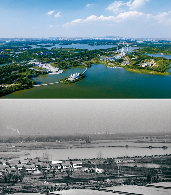 “不要污染的GDP”,向落后产能宣战,成为江苏高质量发展的鲜明导向。位于江苏省徐州市贾汪区的马庄村曾是一个典型的采煤村,因过度开采,该村周边一度是徐州最大的采煤塌陷区。近年来,当地下决心治理生态环境,将村旁的潘安采煤塌陷区改造为潘安湖国家湿地公园。上图为美丽的潘安湖国家湿地公园,下图为马庄村旧貌。 新华日报社供图