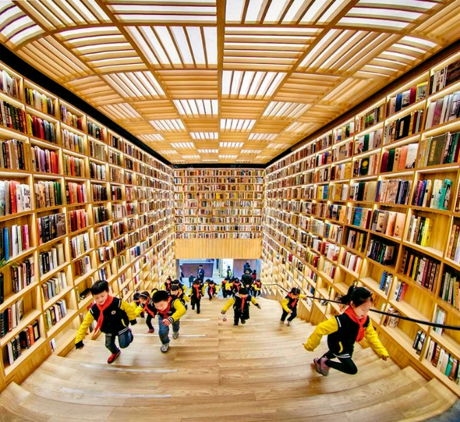 以文化人、以文育人、以文培元,高质量发展才有强劲的动力、旺盛的活力。图为2019年4月27日,江苏省宿迁市泗洪县装饰一新的新华书店,百余名天真可爱的小学生在家长的带领下,高兴地奔向书的海洋。 中新社发 张连华/摄