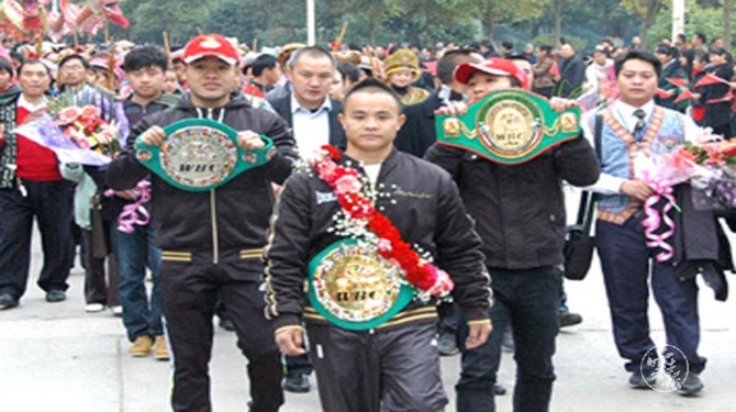2012年11月24日晚,在昆明市体育馆进行的中国第一场世界级拳王争霸赛中,来自云南文山的苗族拳手熊朝忠历经12个回合的精彩拼打,以3比0一致判定击败墨西哥拳手哈维尔-马丁内斯,荣臻WBC职业拳击迷你轻量级(105磅)冠军。这是中国人历史上第一次获得职业拳击的世界级金腰带,熊朝忠创造了中国职业体育的历史。(云南日报)