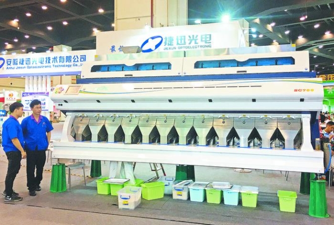 国产粮食色选机研发制造达到了世界先进水平。图为在“第二届中国粮食交易大会”上展出的色选机。 记者刘慧摄