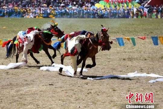 图为玉树传统赛马节暨雪域格萨尔文化艺术节和三江源水文化节开幕式现场马上拾哈达展示。 罗云鹏 摄