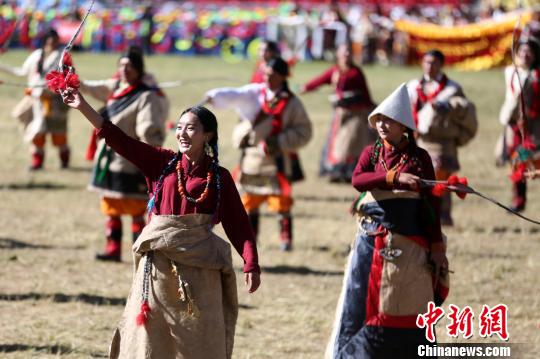 图为玉树传统赛马节暨雪域格萨尔文化艺术节和三江源水文化节开幕式现场游牧文化展示。 罗云鹏 摄