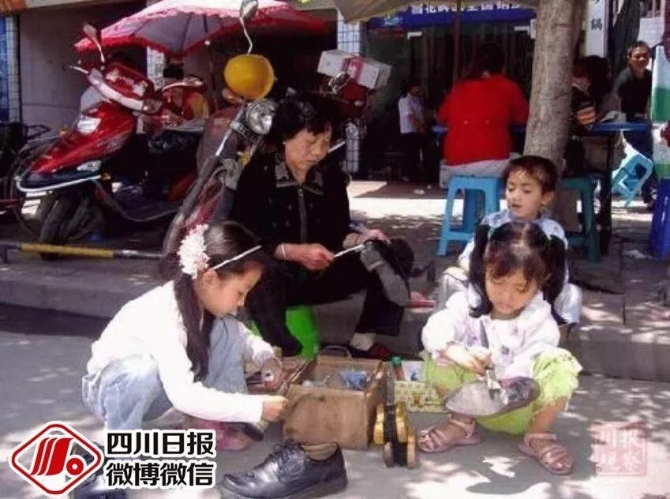 为了维持家庭的基本运转,汪厚芳准备起简单的工具,走上射洪的街头开始擦鞋谋生。从小学一年级开始,每天放学和周末,三个孩子也学起奶奶的模样,拿起擦鞋工具街边摆摊。